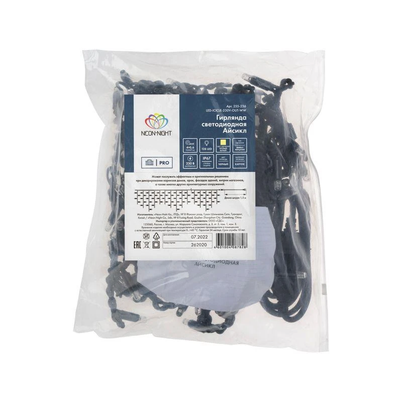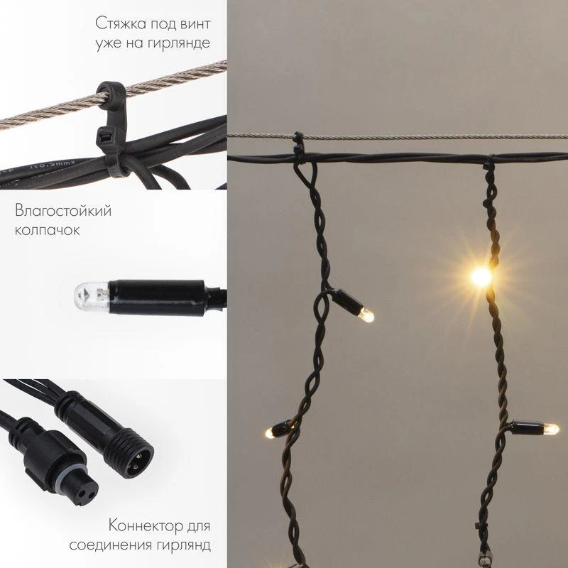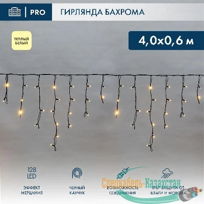 255-236 Neon-Night | Гирлянда светодиодная "Айсикл" (бахрома) 4х0.6м 128LED тепл. бел. 10Вт 230В IP67 эффект мерцания провод каучук черн. (нужен шнур питания 315-000) Neon-Night 255-236