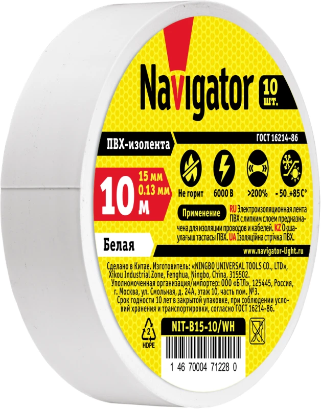 71228 NAVIGATOR | Изолента ПВХ 15мм (рул.10м) бел. NIT-B15-10/WH Navigator 71228