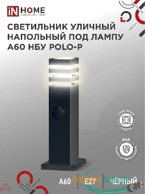 4690612051666 IN HOME | Светильник POLO-SP600WO-A60-BL E27 IP65 600мм под лампу A60 НБУ уличный напольный с розеткой алюм. черн. IN HOME 4690612051666